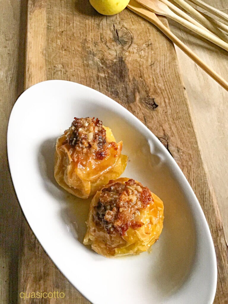 Espelho, espelho meu, essas deliciosas maçãs recheadas são uma fruta gulosa ou uma sobremesa especial? As maçãs são uma fruta muito versátil e são usadas não só em sobremesas. Algumas espécies também são usadas em receitas salgadas, especialmente aquelas com um sabor um pouco mais ácido. Encontramo-las em saladas e em algumas preparações com carne, especialmente carnes de caça. Mais frequentemente, são usadas para preparar tortas e sobremesas deliciosas, exatamente como neste caso. Quem, ao ler o título, pensou na maçã cozida sem graça que evoca más lembranças de hospitalizações, está redondamente enganado, pois estas maçãs cozidas na fritadeira sem óleo e recheadas com guloseimas são uma verdadeira sobremesa. Uma sobremesa saborosa e requintada que você pode servir após o jantar para seus convidados e que, mesmo que você não seja muito habilidoso na cozinha, certamente será capaz de preparar. Sirva as maçãs recheadas com uma colher de sorvete de baunilha ou leite, garanto que será um sucesso!