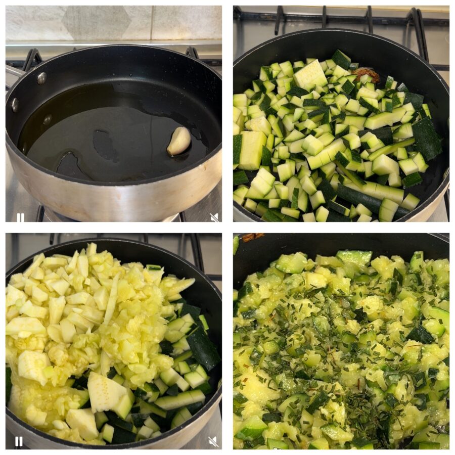 Adicione a polpa de abobrinha ao refogado de alho, junte também as fatias que você tinha tirado da superfície, cortadas em pedacinhos. Deixe amaciar e cozinhar com calma. Finalize com um punhado de salsinha.