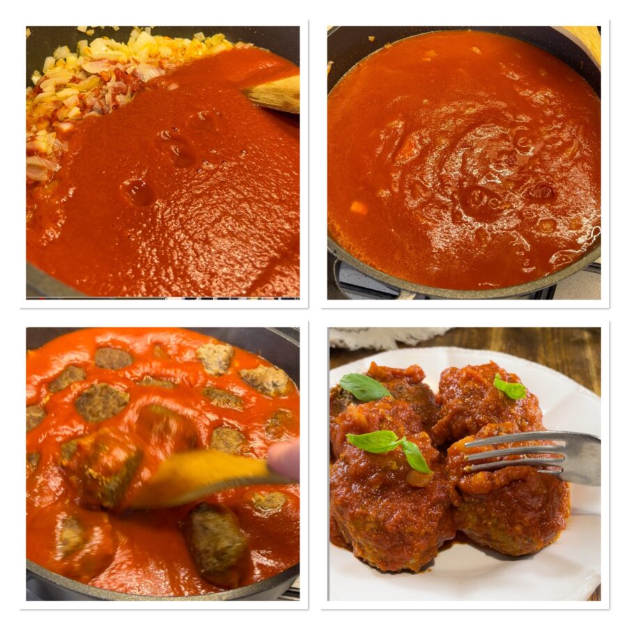 Almôndegas ao molho à siciliana, a receita da vovó para almôndegas ao molho com concentrado de tomate, gostosas como só as avós sabem fazer e ótimas também para temperar massa. Meus filhos adoram almôndegas, sejam almôndegas em folhas de limão ou almôndegas na cerveja ou ainda almôndegas de frango, eles ficam sempre super contentes; mas se há uma receita que realmente os faz pirar, é a das almôndegas ao molho da vovó super macias. No sentido de que eles amam mesmo as almôndegas que a avó faz e não as trocariam por nenhuma outra receita, exceto talvez pelas do molho à catanesa. De fato, as almôndegas de carne ao molho que minha sogra prepara são realmente deliciosas; é uma receita muito tradicional, em que as almôndegas são feitas com cuidado, ricas, saborosas, fritas rigorosamente no azeite de oliva como se fazia antigamente e cozidas depois no concentrado de tomate e na passata. Ela, porém, tem um ingrediente secreto, difícil de reproduzir: anos e anos e anos de experiência na preparação das almôndegas ao molho… Quem sabe um dia, se Deus quiser, eu também chegarei ao seu nível excelente de preparo das almôndegas e então meus netos dirão que as almôndegas ao molho da vovó são as melhores do mundo. Por enquanto, porém, vou ter que me contentar com as críticas dos meus filhos, que dizem sim, suas almôndegas ao molho são boas, mas não são como as da vovó! Esqueci de dizer, vocês sabiam que com o molho das almôndegas dá para temperar massa e que fica realmente delicioso?