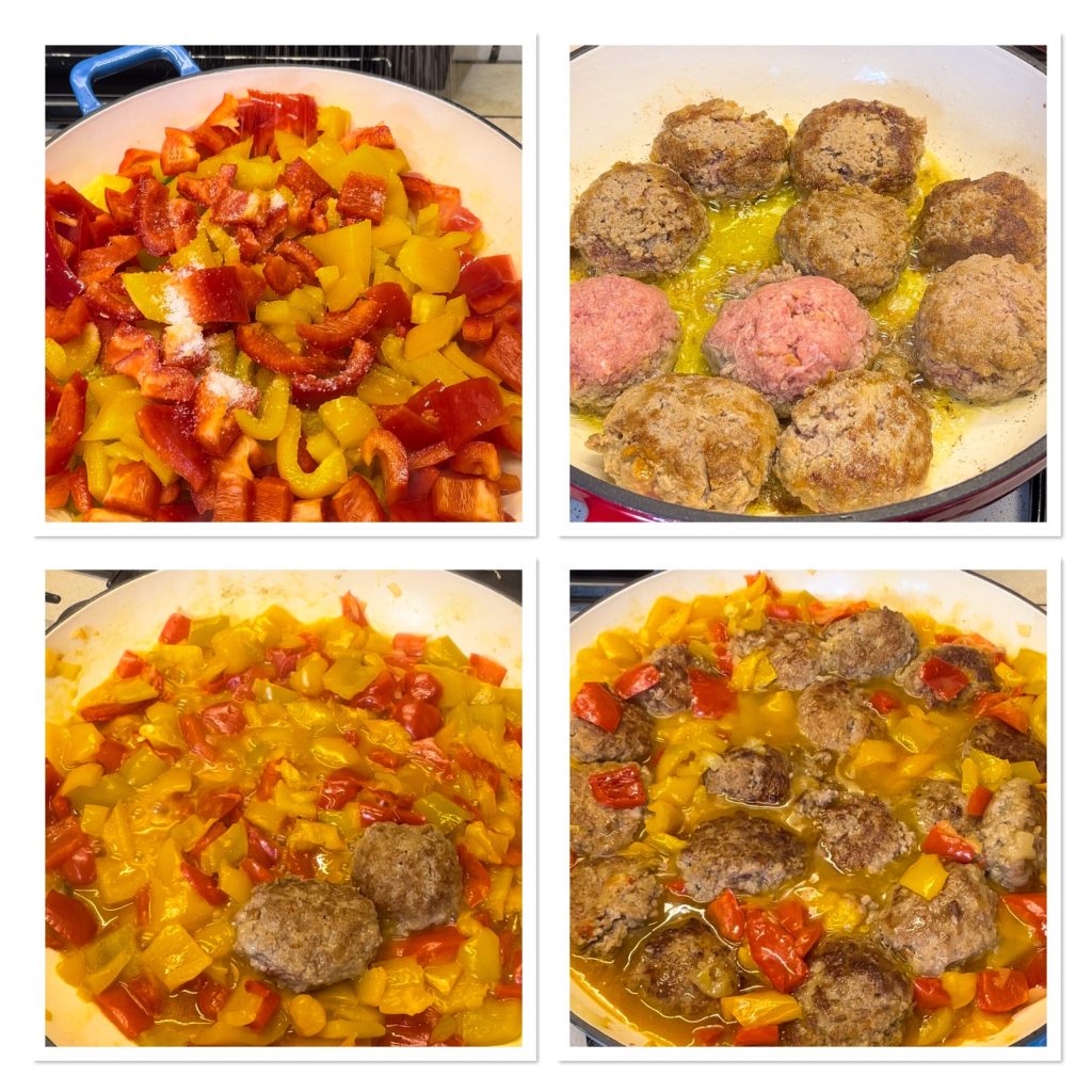 Junte os pimentões, tempere com sal, refogue em fogo alto por alguns minutos e assim que começarem a “suar”, tampe a panela e cozinhe em fogo baixo por 25 minutos, mexendo com frequência e continue cozinhando as almôndegas até que estejam douradas e então você poderá colocá-las sobre os pimentões.