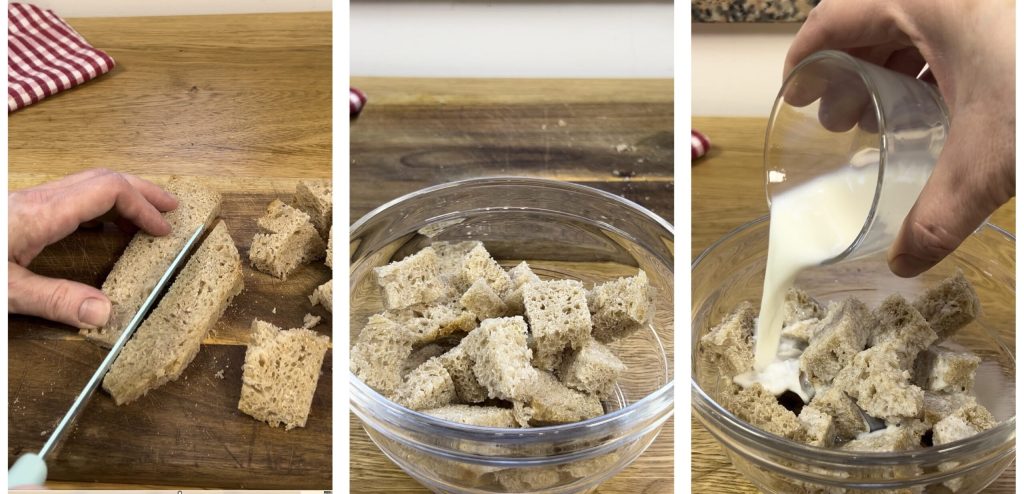 Junte o pão amanhecido de alguns dias numa tigela, depois de cortá‑lo em pedaços; se for rústico como o meu, retire a casca quando estiver muito dura.