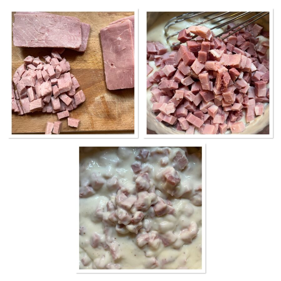 Compre presunto cozido em pedaços e corte em cubinhos, depois misture ao bechamel frio. Corte também o queijo em cubos.
