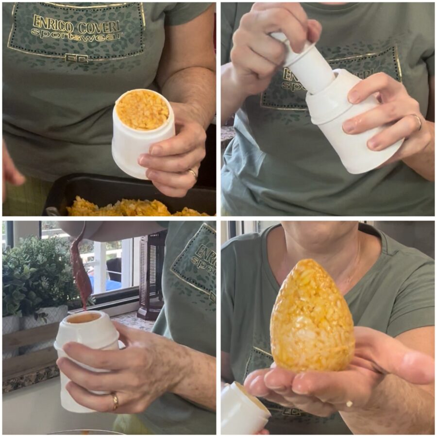 Se você usar a forma, como a que eu tenho, aqui estão fotos passo a passo (veja abaixo). Encha a primeira parte da forma com arroz, posicione a segunda parte, insira o encaminhador, pressione, formando uma cavidade que você preencherá com ragù e um ou dois cubinhos de queijo que você cortou previamente. Tampe com um pouco de arroz e desenforme.