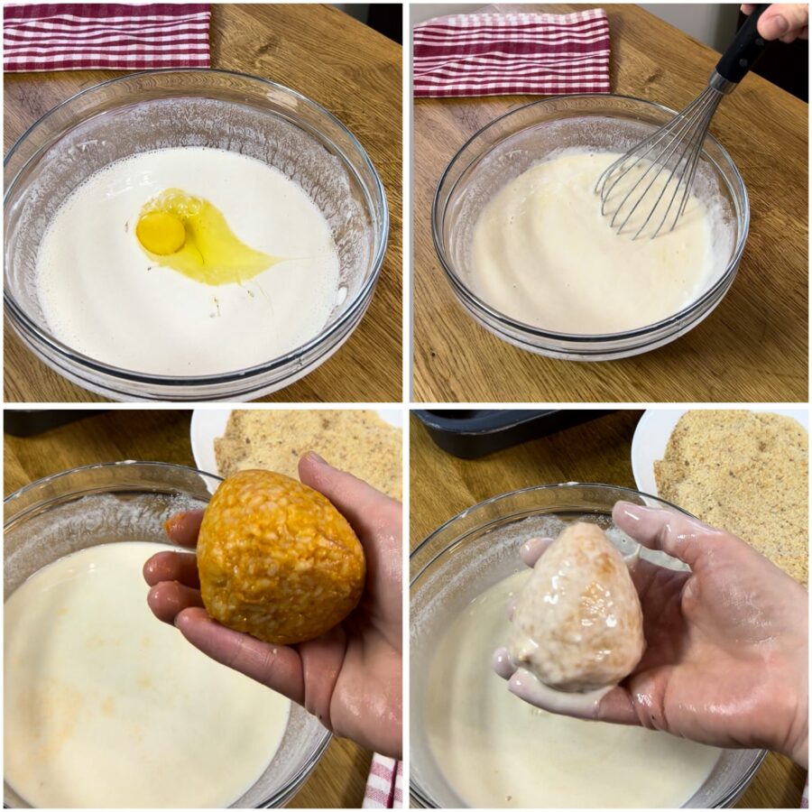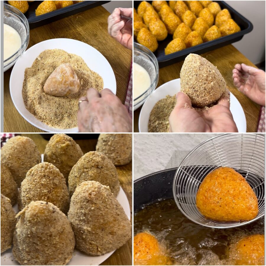 Mergulhe cada arancino na massa, escorra e passe na farinha de rosca.