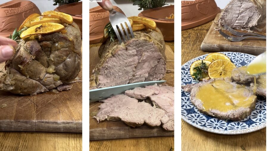 Assado de porco super macio, assado no forno, na panela de barro, uma receita super fácil como o assado com molho barbecue ou o assado de coppa ao prosecco. Alguns dias atrás encontrei em promoção no supermercado a famosa assadeira de barro Römertopf, uma panela de terracota prensada em forma de barco, com tampa em cúpula. Esta panela especial, ideal também para cozimentos em baixa temperatura, é ótima para preparar assados e, por prender todos os sucos e aromas, dá ao prato final uma maciez e um sabor deliciosos. Naturalmente, se você não tiver essa panela, pode substituí-la por uma panela de ferro fundido, uma panela de barro comum ou uma assadeira com tampa adequada. Tendo comprado a panela e não vendo a hora de usá-la, pedi ao meu açougueiro de confiança um belo pedaço de coppa de porco (coppa), um corte que assa sem dificuldades e que fica sempre muito macio e suculento graças às estrias de gordura que o atravessam. Depois corri para a cozinha para colocá-lo em prática, preparando este assado com perfume de laranja, delicioso e super macio! Querem provar também? Vamos para a cozinha, com este prato vocês vão surpreender todos os seus convidados, preparando um segundo perfeito para o Natal, Ano Novo e todos os domingos de festa! Lembro também que, se quiserem ficar atualizados sobre novas receitas, podem seguir minha página Facebook e meu perfil Instagram.