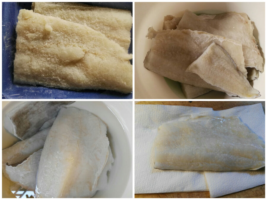 Depois de comprar o peixe, lave-o em água corrente e elimine o excesso de sal; em seguida coloque-o numa bacia e cubra com água bem fresca. Deixe repousar 8 horas, enxágue e troque a água; proceda assim por pelo menos 36 horas ou até que, provando o peixe, você perceba que perdeu o excesso de sal.