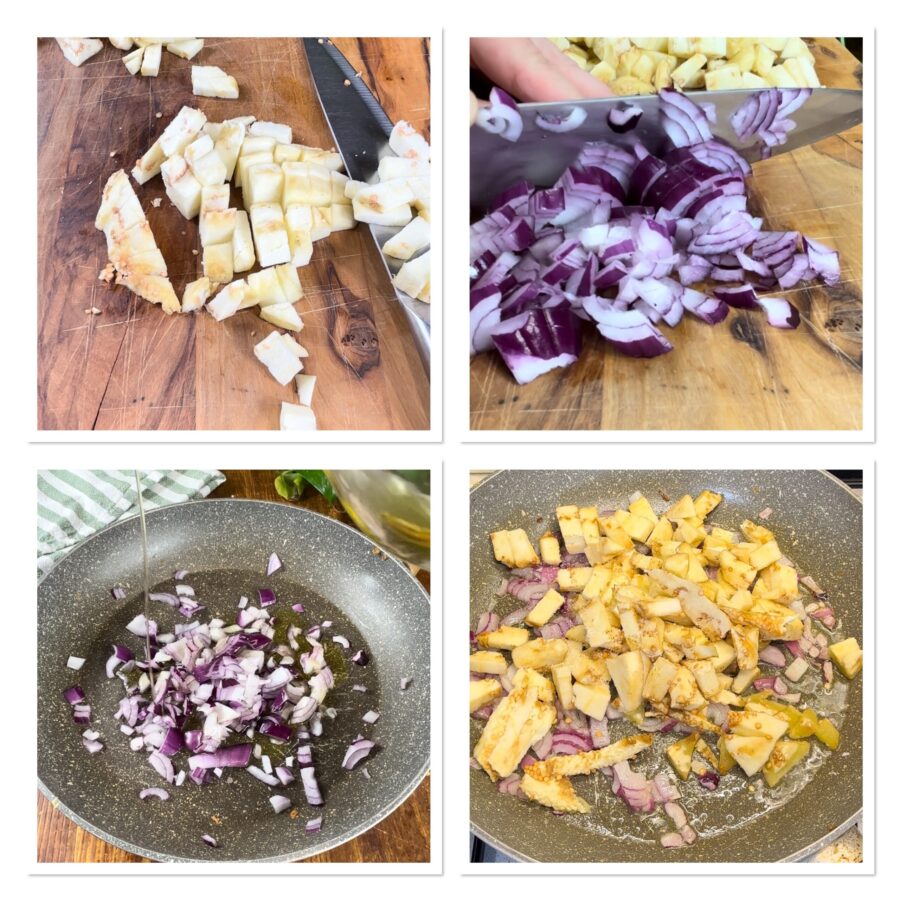Pique a polpa da berinjela em cubinhos e pique uma cebola. Doure a cebola em uma frigideira ampla com bastante azeite, junte a berinjela em cubos, tempere com sal e deixe apurar bem os sabores.