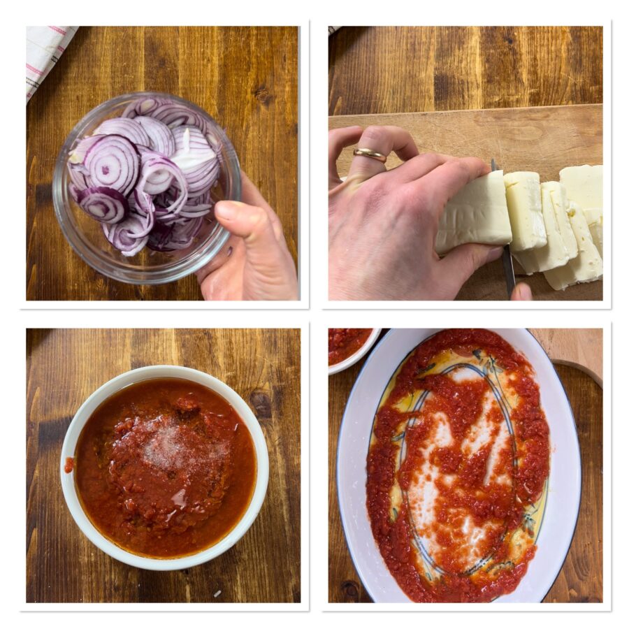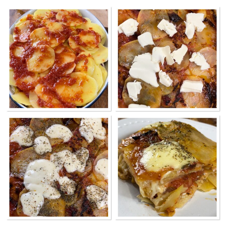 Batatas à pizzaiola assadas com cebola e mussarela, receita siciliana da minha mãe.