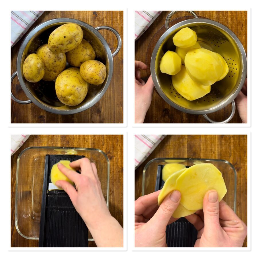 • Lave as batatas, descasque-as e corte em fatias bem finas e uniformes; eu prefiro usar a mandolina. Faça o mesmo com as cebolas: descasque e fatie finamente.