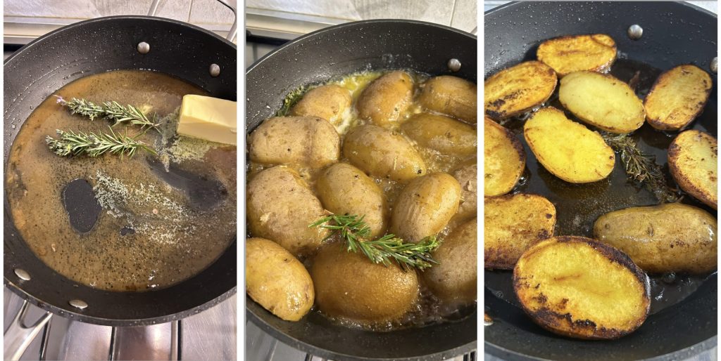 • Para preparar este acompanhamento você vai precisar de batatas cozidas; se não souber como cozinhá-las, basta mergulhá-las em água e ferver por 30-35 minutos ou até que, ao espetá-las com um palito, fiquem macias. Pegue o fundo de cozimento da carne, se você o selou na frigideira, e derreta nele a manteiga; caso contrário, derreta a manteiga diretamente. Coloque um ramo de alecrim, corte as batatas ao meio, preferencialmente sem remover a casca, e coloque-as com o lado cortado diretamente na manteiga, cozinhe em fogo alto deixando dourar bem. Tempere com sal e sirva junto com o rosbife e seus assados.