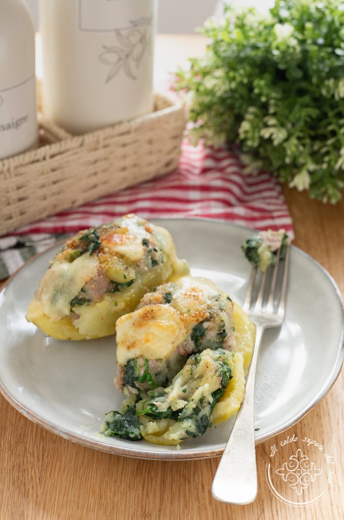 Batatas assadas recheadas com linguiça e espinafre, um segundo prato fácil e saboroso, mas também um acompanhamento ou entrada delicioso, exatamente como os Tortini de batata individuais. As barquinhas de batata são uma preparação simples que pode ser declinada de mil formas e que fica sempre uma delícia, assim como estas batatas recheadas com linguiça e espinafre. As batatas são um dos ingredientes básicos da nossa cozinha e as receitas com batata são sempre a solução certa quando se quer levar à mesa algo econômico e saboroso ao mesmo tempo. Entre as minhas receitas preferidas estão as barquinhas de batata assada e eu já preparei várias, como as Barquinhas de batata com atum e maionese, as batatas recheadas com mortadela e queijo, as Batatas recheadas com cogumelos e as Batatas recheadas cremosas com presunto, provola e parmesão. Hoje, seguindo essas ideias gostosas, pensei em preparar uma versão com linguiça e espinafre super gostosa, perfeita para servir como segundo prato, como prato único, mas também como entrada e acompanhamento: quer experimentar? Vamos para a cozinha que eu explico a receita, mas antes lembro que, se quiser ficar por dentro de todas as minhas receitas, você pode seguir minha página no Facebook (aqui) e meu perfil no Instagram (aqui) e que aqui você encontrará muitas Receitas com espinafre igualmente deliciosas.