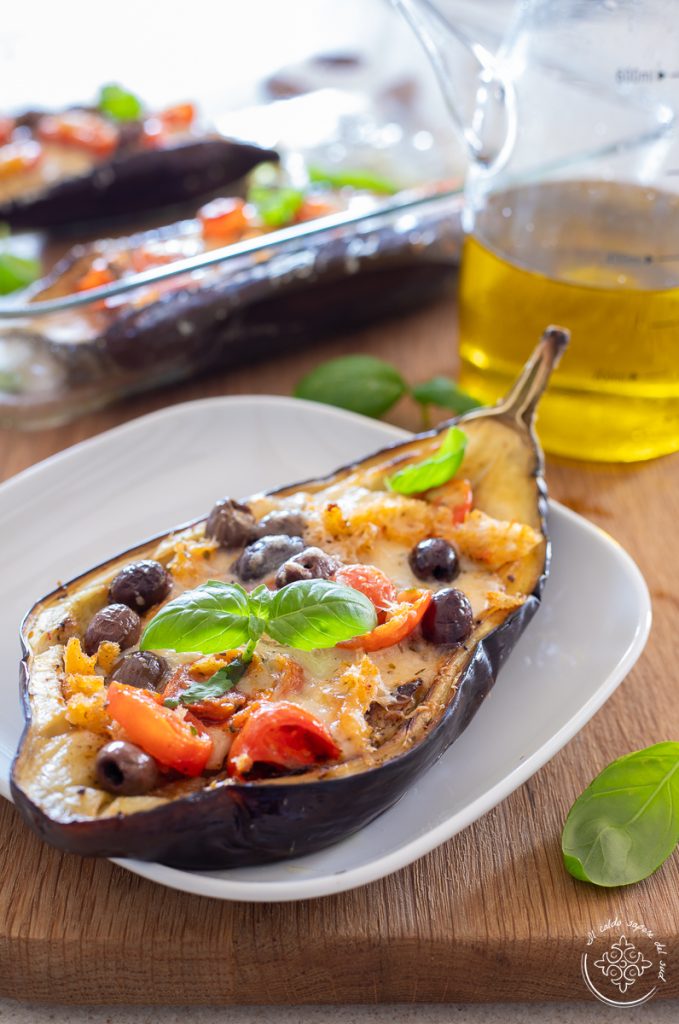 Esta é uma receita fácil, perfeita tanto como segundo prato à base de hortaliças quanto como prato único leve e vegetariano. As berinjelas assadas recheadas podem ser preparadas com antecedência, servidas quentes, mas ficam deliciosas também morna, quando os sabores se assentam e ficam ainda mais intensos. No fundo são verdadeiras barquinhas de berinjela, macias e prontas para receber o recheio. Depois de assadas, escava-se um pouco a polpa e elas viram o recipiente perfeito para todos os sabores mediterrâneos.