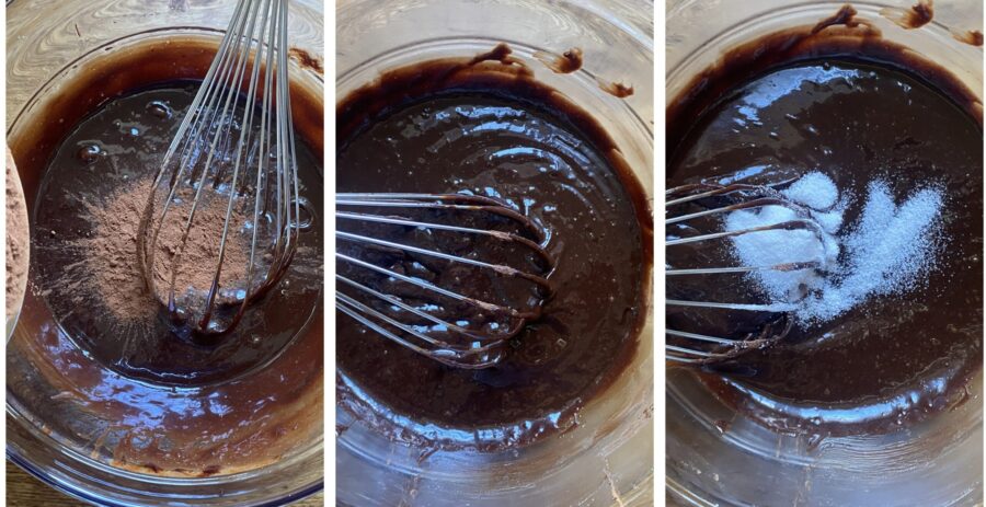 Continuando a mexer, adicione o chocolate já derretido e o óleo de girassol,