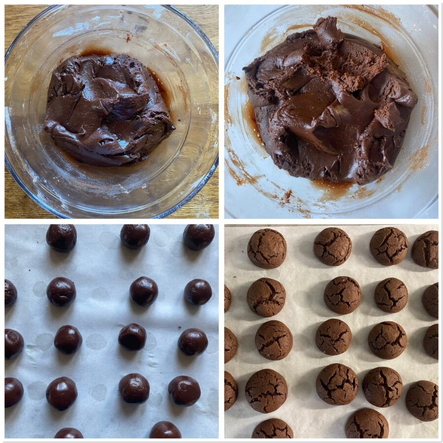 Depois de adicionar todos os ingredientes, a massa vai ficar bem mole e pouco manejável, então certifique-se de deixá-la na geladeira para esfriar, coberta com filme plástico, por pelo menos 40 minutos. Depois desse tempo, comece a pré-aquecer o forno. Forre a assadeira com papel manteiga e forme bolinhas de massa com cerca de 4 cm de diâmetro.