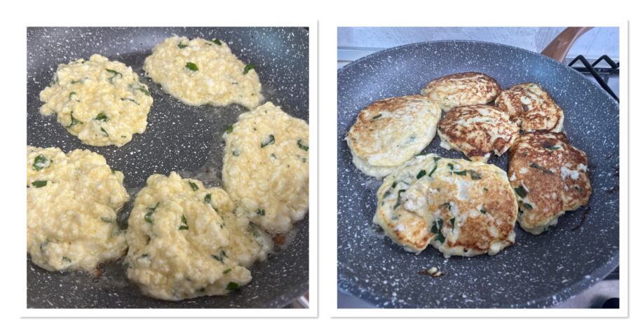 • Aqueça uma frigideira com um fio de óleo e coloque a mistura usando uma colher, moldando os bolinhos. Cozinhe em fogo médio de um lado e, assim que estiverem dourados, vire delicadamente com uma espátula, tomando cuidado para não quebrá-los.