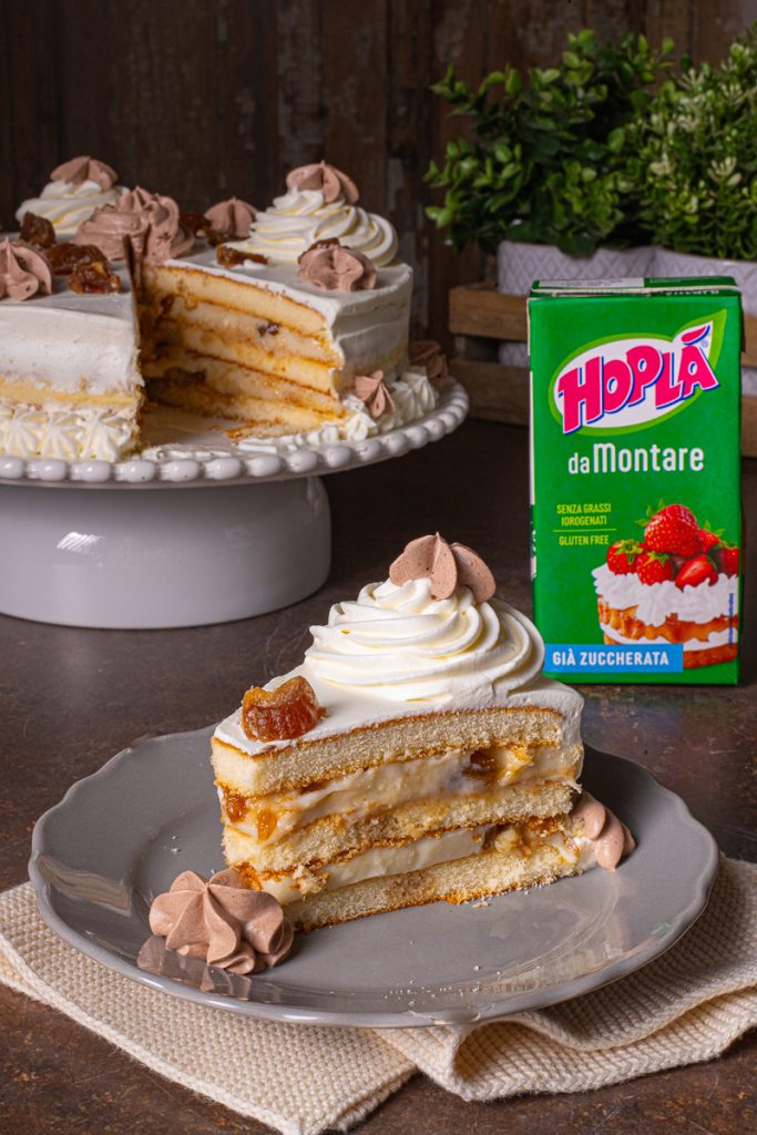 Para preparar esse bolo delicioso você vai precisar de um pequeno pão-de-ló; se quiser, pode comprá-lo pronto ou testar minha receita indicada no link acima. Quanto ao creme, vale um clássico creme de confeiteiro que você pode fazer em casa, ou preparar minha versão da avó, com um único ovo, leve e super fácil. Para minha “falsa” creme de confeiteiro, dissolva em um pouco de leite a farinha, o açúcar (você também pode usar 150 g para uma versão um pouco menos doce), o ovo e a baunilha, mexendo rapidamente para evitar a formação de grumos. Quando a mistura estiver homogênea, acrescente o restante do leite e misture. Deixe engrossar em fogo médio, mexendo continuamente. Desligue pouco antes da fervura, acrescente as raspas de um limão, 50 g de marrons glacês batidos retirados do total. Misture novamente com as varas (ou batedor) e coloque o creme para esfriar em uma tigela. Enquanto o creme esfria, mexa-o com frequência para que fique brilhante e aveludado. Enquanto o creme esfria, coloque a embalagem de Hoplà para bater na geladeira: a cerca de 4°-6°C o produto rende melhor e sobe com extrema facilidade. Com o creme bem frio, nunca antes, bata o Hoplà na batedeira ou com o batedor; retire 1/3 e incorpore ao creme, trabalhando delicadamente.