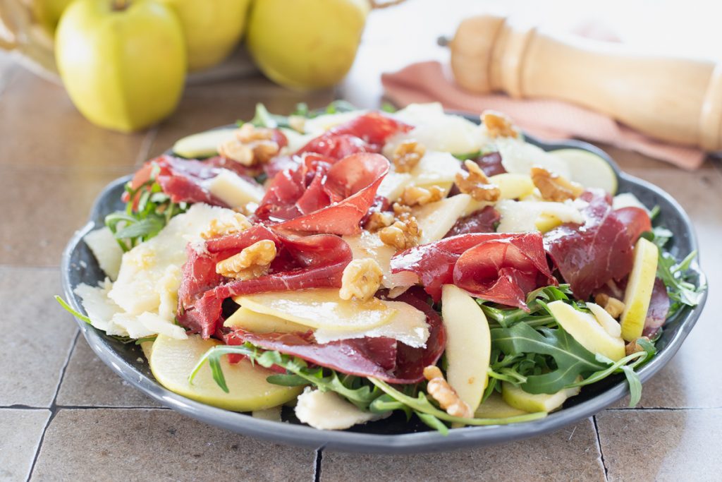 Bresaola, rúcula, maçã e nozes. As saladas de verão gostosas ou simplesmente as saladas em geral são minha paixão e as que mais amo são as saladas com frutas frescas e frutas secas, exatamente como esta salada com rúcula, maçã, nozes, bresaola e grana. Uma salada que, se acompanhada de crostini de pão aromatizados assados ou de um simples pão caseiro, vira um prato único saudável e leve, realmente saboroso! Vamos para a cozinha, eu explico minha receita em um instante, mas antes lembro que se quiserem ficar por dentro das minhas receitas, podem seguir minha página no Facebook (aqui) e meu perfil no Instagram (aqui).