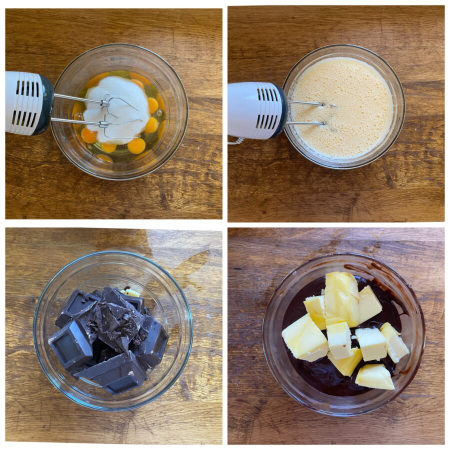 Para fazer os Brownies de avelã, bata os ovos com o açúcar em uma tigela grande (não é preciso montá-los). Em outra tigela, derreta o chocolate em banho-maria ou no micro-ondas em 350 watts, mexendo frequentemente para não queimar. Assim que estiver pronto, junte a manteiga e misture bem, garantindo que ela derreta por completo.