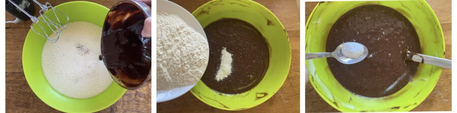Junte o chocolate aos ovos e misture tudo. O chocolate, por ser mais pesado, tende a se acumular no fundo, por isso mexa bem para incorporar todo o composto. Acrescente a farinha, o sal e a baunilha.