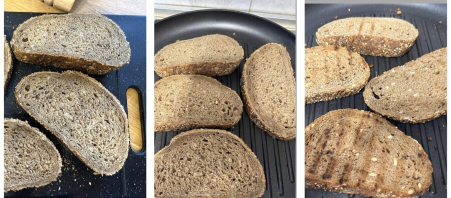 • Corte o pão em fatias de 1,5 cm, coloque-as sobre uma chapa de ferro bem quente e grelhe dos dois lados, até formar as clássicas marcas. A esse ponto você pode esfregar cada fatia com um dente de alho; eu não faço isso porque não gosto muito do cheiro forte, prefiro adicionar um pouco de alho ao tomate.