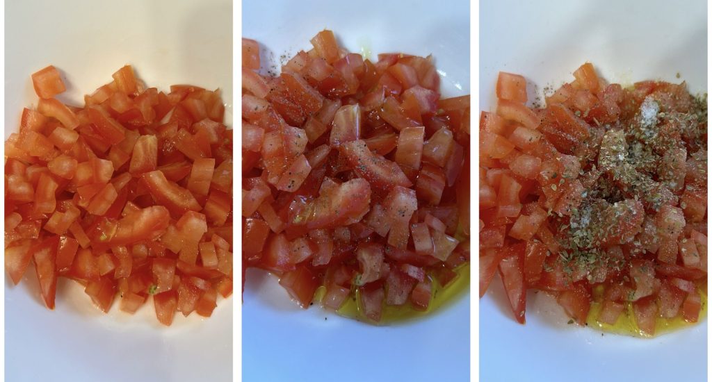 • Lave os tomates, que devem estar frescos e firmes; corte-os em gomos e retire as sementes e a parte aquosa, em seguida corte em cubinhos e coloque-os em uma tigela.