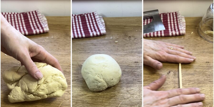 Forme uma bola o mais lisa e homogênea possível, cubra-a com uma tigela e deixe-a descansar por cerca de dez minutos. Em seguida, corte um pedaço pequeno e estique formando um cordão longo e fino, mantendo o restante da massa coberto para que não resseque.