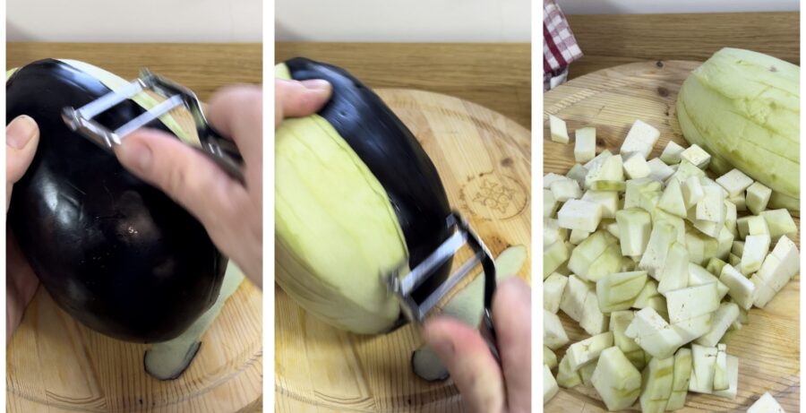 • Lave as berinjelas, descasque-as e corte em cubinhos, coloque-as em um escorredor,