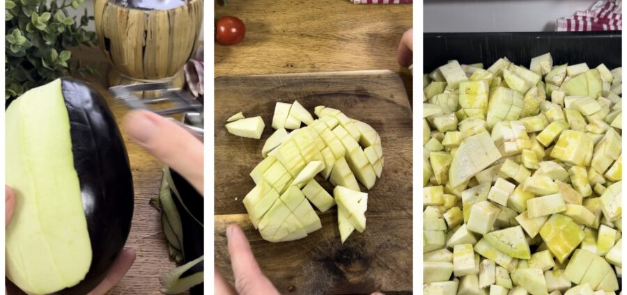 • Lave as berinjelas, descasque-as e corte em cubinhos (se não descascar, a caponata ficará bem mais escura e, de qualquer forma, a casca ficará dura). Coloque-as em uma assadeira bem grande, regue com um bom fio de azeite, salpique sal e asse no forno, de preferência ventilado, a 200°C por 30 minutos, mexendo com frequência. Usando uma assadeira grande as berinjelas vão secar melhor, soltando menos água.