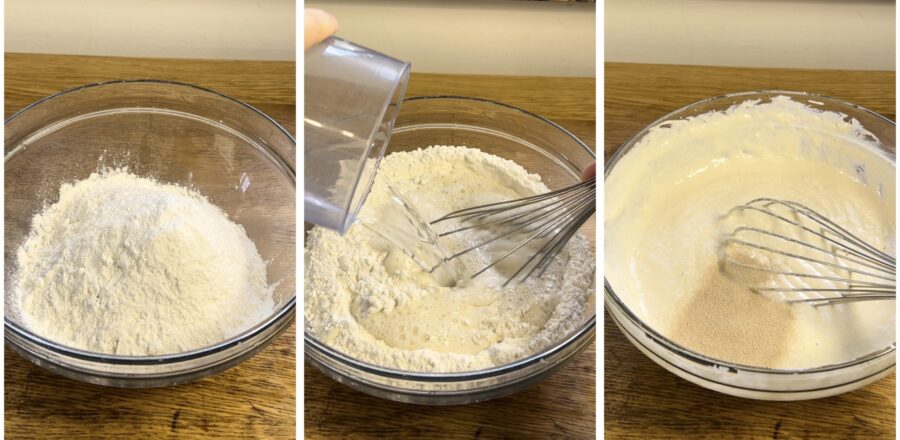Coloque a farinha em uma tigela, misture com a água morna aos poucos e termine adicionando primeiro o fermento e só por último o sal. Obtendo uma massa homogênea sem grumos, deixe em um local aquecido para fermentar até dobrar de volume; podem ser necessários 60 a 90 minutos.