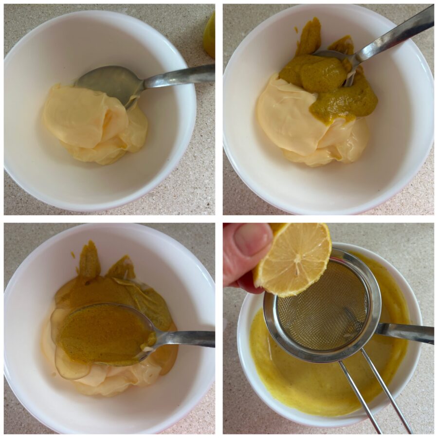 Em uma tigelinha coloque a maionese, depois acrescente a mostarda e o mel. Misture com uma colher até obter um creme liso e homogêneo, com um tom levemente dourado.