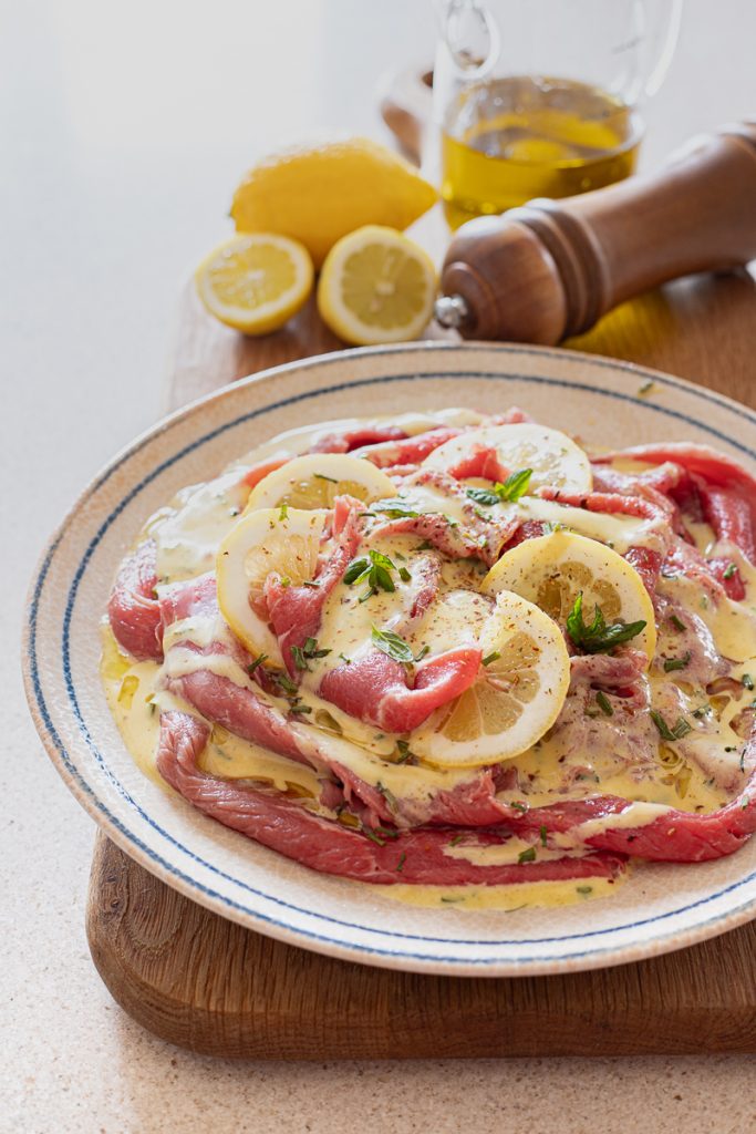 O carpaccio de filé bovino com molho de mel, mostarda e limão é um prato principal fresco, rápido e cheio de sabor, perfeito quando você tem vontade de algo leve mas diferente do de sempre.