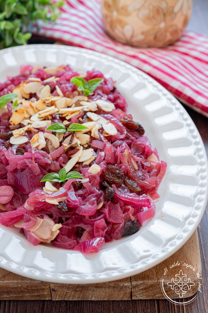 Hoje, porém, quero falar de uma das minhas receitas preferidas: as cebolas roxas de Tropea em agridoce, cozidas na frigideira do jeito que minha avó fazia, com a adição de uva-passa e amêndoas. Um prato vegano e vegetariano, simples e saboroso, perfeito para servir como acompanhamento de carne ou legumes ou como entrada .