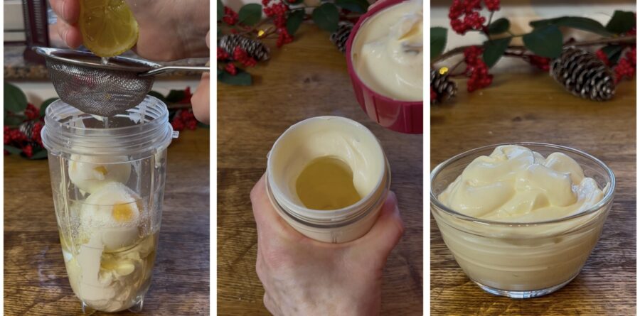 Vamos começar pela maionese esperta. Cozinhe os ovos mergulhando-os em água fria e contando 10 minutos a partir da fervura, escorra, descasque e deixe amornar. Coloque-os no copo do liquidificador junto com o iogurte (ou o cream cheese para um sabor mais suave), o sal, o açúcar, o óleo e o suco de limão. Bata até obter um molho o mais liso e homogêneo possível — muito vai depender da potência do seu liquidificador. Transfira a maionese esperta para uma tigela e leve à geladeira até ficar completamente fria e um pouco mais firme. Enquanto isso, dedique-se à massa amanteigada.