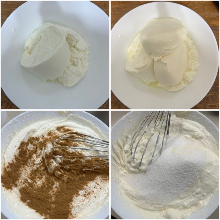 Em uma tigela, trabalhe a ricota bem escorrida com o mascarpone até obter um creme liso.