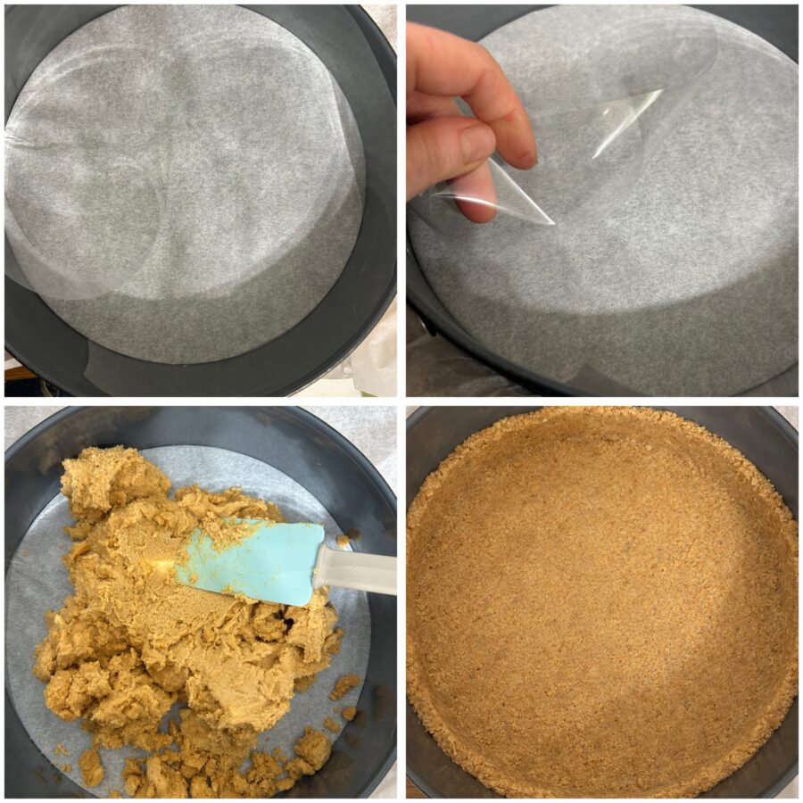 Para conseguir bordas perfeitas eu forrei a forma com acetato para confeitaria, um filme transparente muito usado em patisserie. Como alternativa, vocês podem usar simplesmente uma tira de papel manteiga, que ajuda a desenformar a cheesecake facilmente e a manter as laterais lisas e regulares.