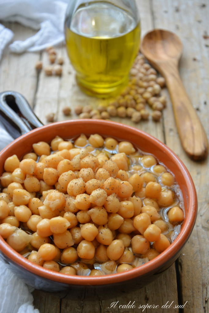 • É hora de cozinhar o grão-de-bico: pegue uma panela grande de fundo grosso, ou melhor ainda uma panela de barro, coloque os grãos e cubra com água — para 500 g bastam 2 l. A água é um fator importante na preparação desses leguminosos; recomendo usar água com baixo teor de sais, até a água mineral com pouco sódio pode servir. Usar uma água pouco mineralizada e levemente ácida, além de realçar o sabor do grão-de-bico, ajuda a que ele cozinhe sem se desmanchar. Coloque a panela no fogo bem baixo, em chama média; se usar panela de barro, lembre‑se de usar um difusor de chama. Espere que comece a formar espuma — levará cerca de 30/40 minutos — e então retire a espuma com uma peneira. Assim que começar a ferver, se possível, tampe a panela e deixe cozinhar; se a panela for pequena, evite tampar completamente para não transbordar o líquido. Não mexa muito os grãos e, se for mexer, use uma colher de madeira, pois o metal pode endurecê‑los. Cozinhe os legumes por cerca de três horas e corrija o sal apenas 30 minutos antes do final. Assim cozidos, os grãos-de-bico podem ser usados em todas as receitas, desde saladas frias até sopas e caldos. Nós os serviremos puros, com um fio generoso de azeite extravirgem, pimenta‑do‑reino, alguns ramos de alecrim e um bom pão caseiro tostado… Bom apetite!