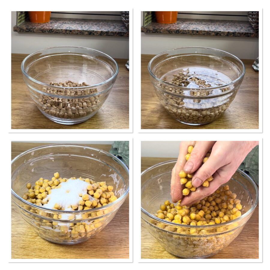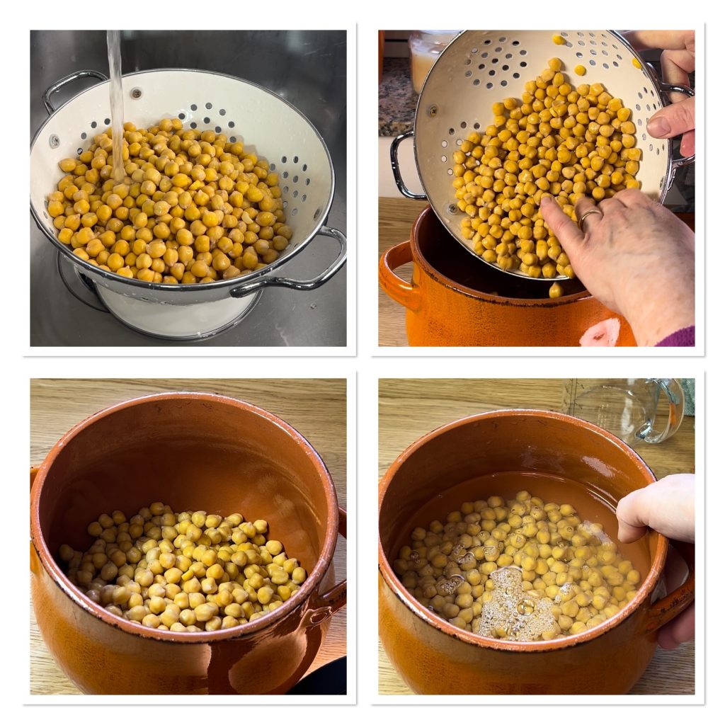 • A preparação de um bom prato de grão-de-bico exige dedicação e paciência. Os grãos secos precisam ficar de molho de 12 a 24 horas, não mais do que isso, então se pretende prepará‑los, organize‑se com antecedência. Lave bem os grãos, coloque‑os numa tigela de vidro, junte o dobro do volume em água e deixe reidratar. Após esse tempo, os leguminosos terão triplicado de volume. Escorra e esfregue‑os entre si com uma colher de sal; esse procedimento ajudará o grão-de-bico a cozinhar melhor e a não ficar duro.