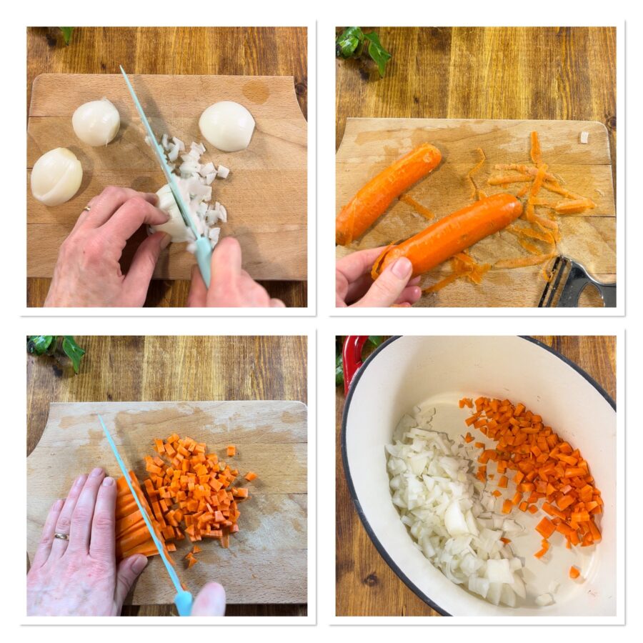 Descasque, lave e pique as cebolas, coloque tudo em uma panela grande de fundo grosso, mexa bem e refogue em fogo baixo.