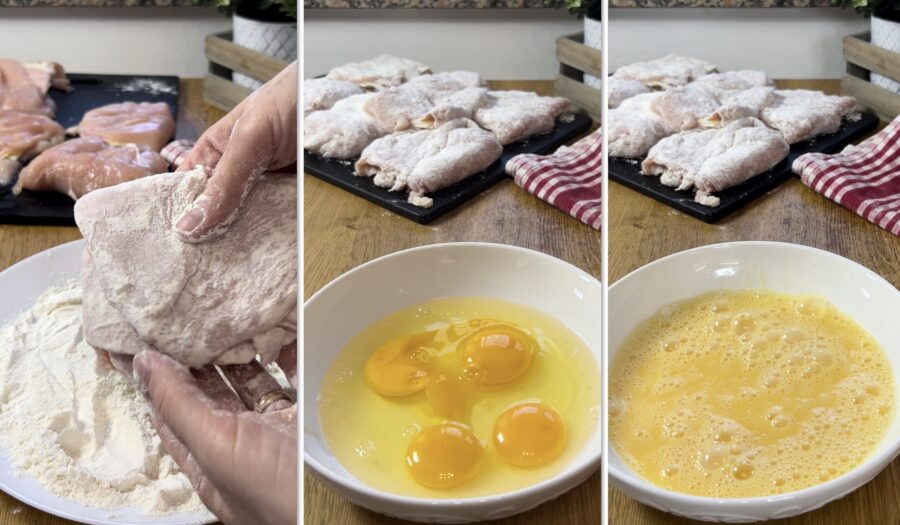 Coloque uma fatia grossa de queijo na base do filé e dobre a parte superior sobre ela, de modo que tanto o presunto quanto a carne envolvam o queijo. Feitas as cotoletes “em carteira”, passe‑as na farinha.