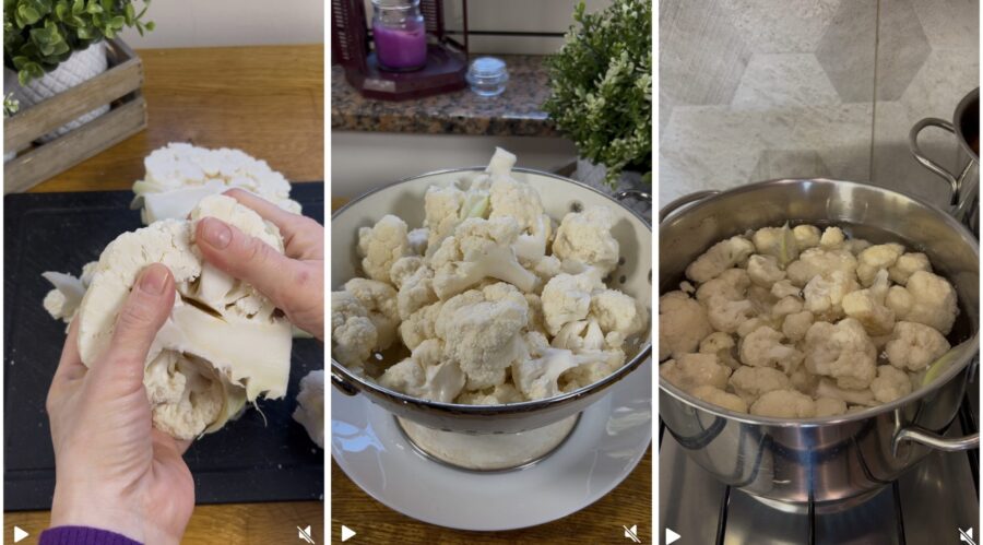 • Feito o bechamel, dedique-se ao couve-flor e depois às batatas: separe os buquês de couve‑flor uns dos outros, lave-os e mergulhe‑os na água fervente levemente salgada.
