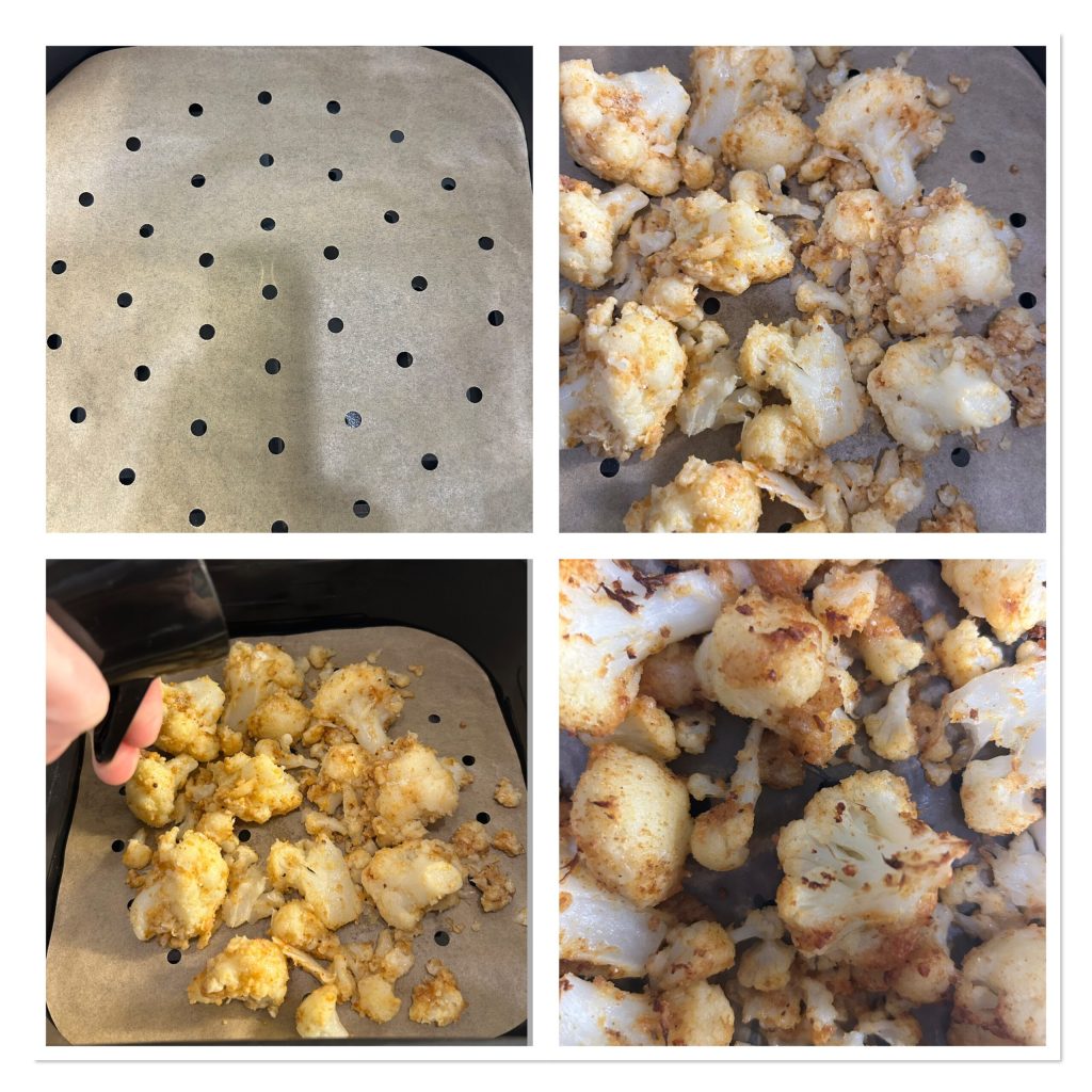 Misture tudo delicadamente, coloque uma folha de papel para airfryer na grade da sua airfryer (se não tiver, não coloque nada), dê algumas borrifadas de azeite e cozinhe a 200° por 15 minutos, ou até atingir a douradura desejada, mexendo um pouco os floretes para virá-los, na metade do cozimento.