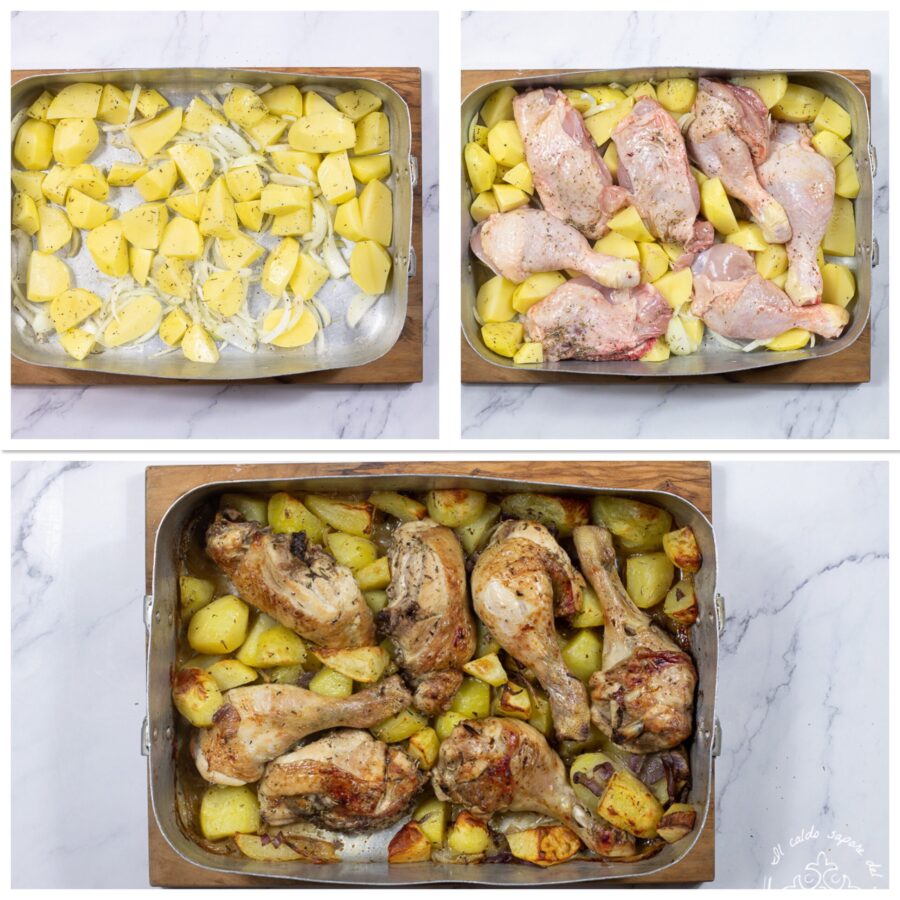 Asse em forno pré-aquecido a 180°C, ventilado ou convencional, por cerca de 60-70 minutos, dependendo do tamanho dos pedaços. Durante o cozimento, vire o frango de vez em quando, tomando cuidado para não amassar as batatas.