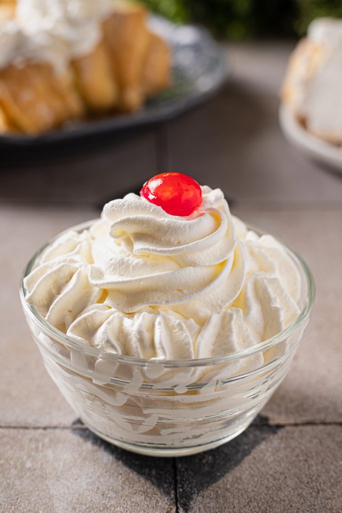 Recomendo preparar o chantilly na hora; em alternativa, é possível conservá-lo na geladeira por no máximo uma hora, depois disso tende a talhar. Se quiser que dure mais tempo, bata junto com um pouco de mascarpone — não será mais chantilly puro, mas ainda ficará super saboroso.