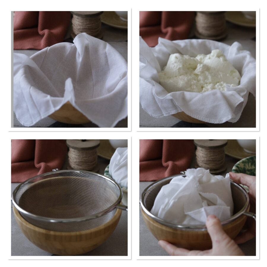 • Para preparar esse creme você vai precisar de uma ricota seca e bem escorrida; então comece com pelo menos 1,6 kg de ricota fresca, coloque-a em um pano de algodão, forme um pacotinho e apoie-o sobre uma peneira colocada dentro de uma tigela. Quanto mais seca a ricota estiver, melhor será o resultado; portanto leve à geladeira e deixe escorrer por pelo menos 12 horas, trocando o pano se ficar muito molhado ou apoiando-o sobre outro.