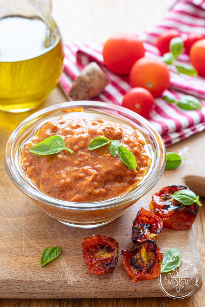 Molho de tomatinhos confit, o condimento saboroso e apetitoso com todos os aromas do verão. Esta é a receita de um condimento de verão, perfeita quando as receitas com tomatinhos estão na estação. Saboroso, perfumado e delicioso, este molho, como o pesto de tomatinhos, nos permite levar à mesa uma massa de verão que conquista todo mundo, e um molho que dá vontade de ser comido também com pizza, focaccias, pão e bruschettas, ou até mesmo com uma colherzinha!! Mas vamos para a cozinha, nossa receita nos espera; antes de arregaçar as mangas, lembro que, se quiser ficar por dentro das minhas receitas, você pode seguir minha página Facebook e meu perfil Instagram.