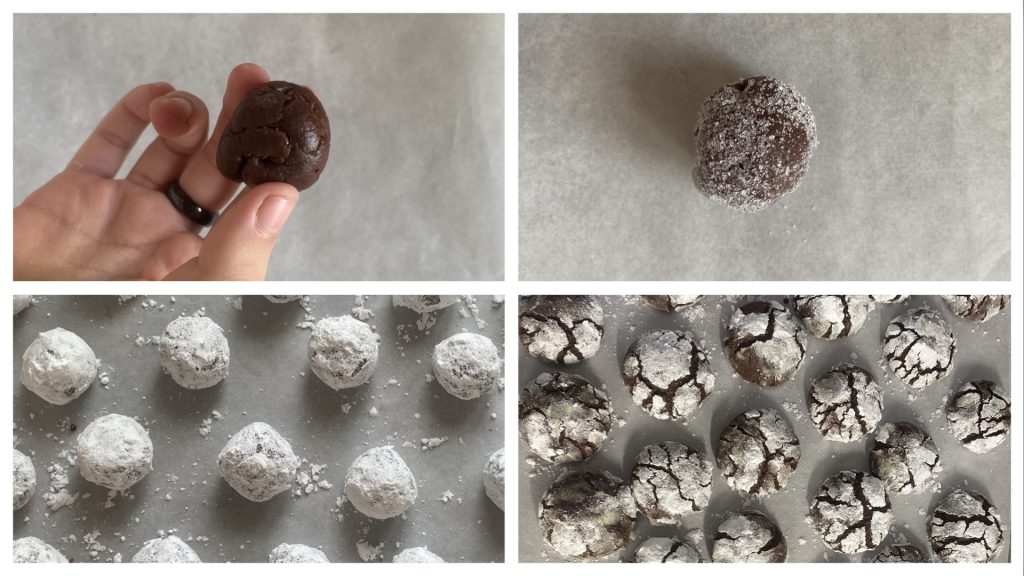 Uma vez descansada a massa, prepare uma assadeira forrada com papel manteiga e duas tigelinhas: uma com açúcar granulado e outra com açúcar de confeiteiro. Comece a formar bolinhas do tamanho de uma noz (4-5 cm): role-as primeiro no açúcar granulado, depois no açúcar de confeiteiro. Certifique-se de que o máximo possível de açúcar de confeiteiro grude nelas para garantir o típico aspecto rachado dos biscoitos.