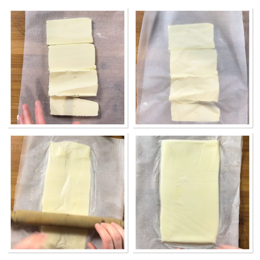 Depois do descanso da massa, prepare a manteiga para a folhadura. Pegue uma folha grande de papel manteiga, disponha a manteiga cortada em pedaços e feche como um pacote. Trabalhe a manteiga até obter uma placa retangular com cerca de 4 mm de espessura, 35 cm de altura por 20 cm de largura, com bordas bem definidas. Leve à geladeira para firmar.