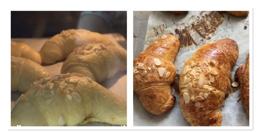Após as horas de fermentação os croissants estarão inchados e dobrados de volume. Pincele com ovo batido junto com leite e, se quiser, polvilhe com açúcar granulado ou amêndoas.