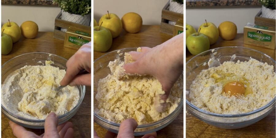 depois com as mãos, até obter uma farofa. Adicione o ovo e incorpore-o rapidamente à massa, mas sem mexer demais; você deve obter uma mistura granulada.