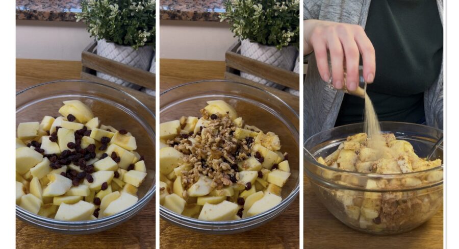 O crumble com maçã, nozes e passas se conserva em temperatura ambiente por 24h, coberto com um pano de algodão.